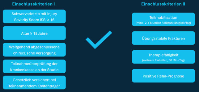 Die untersuchte Population umfasst erwachsene Patientinnen und Patienten (Mindestalter 18 Jahre) nach schweren oder schwersten Verletzungen sowie nach Mehrfachverletzungen (Polytrauma). Die Teilnehmenden sind entweder ausschließlich über die gesetzliche Krankenversicherung (GKV) oder sowohl über die gesetzliche Krankenversicherung als auch die Deutsche Rentenversicherung (DRV) versichert. Voraussetzung für die Studienteilnahme ist, dass die Krankenkasse des/der Patient*in an dem Evaluationsprojekt teilnimmt und dass die vorausgegangene stationäre Behandlung in einem der kooperierenden Krankenhäuser, die einem regionalen/ überregionalen Traumanetzwerk angehören, stattfindet.