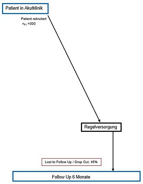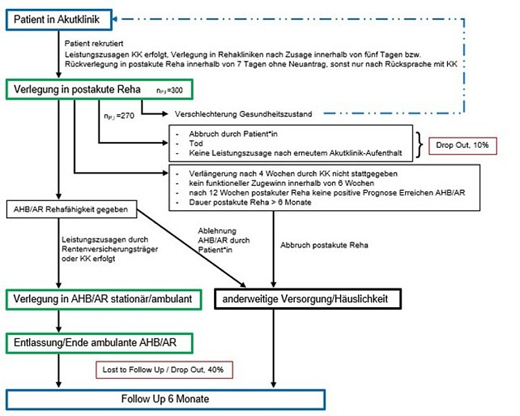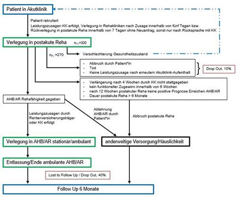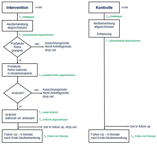 Die Patient*innen werden in den dem Interventionsarm zugeordneten Akutkliniken gemäß den Ein- und Ausschlusskriterien identifiziert. Als erstes holt sich die Akutklinik eine Aufnahmezusage der korrespondierenden Rehaklinik zur möglichen Übernahme ein. Anschließend beantragt sie die Postakute Traumarehabilitation bei der zuständigen Krankenkasse. Die Beantragung erfolgt mit dem AR-Antrag der GKV (in der Fassung vom 01.03.2024). Diesem sind der zugehörige ärztliche Befundbericht sowie das ausgefüllte Formular mit den zusätzlich erforderlichen Angaben beizufügen. Nach der Zusage (zunächst für 4 Wochen) durch die versichernde Krankenkasse werden die Patient*innen final über die Studie aufgeklärt und eingeschlossen. Es erfolgt die Datenerhebung der Akutklinik zum Abschluss des Akutaufenthaltes. Die Patient*innen werden in die Rehaklinik übergeleitet und die postakute Traumarehabilitation beginnt. Es erfolgt das Aufnahmeassessment sowie die Erhebung der sozioökonomischen Daten und der gesundheitsbezogenen Lebensqualität. In den wöchentlichen interdisziplinären Teamsitzungen wird der Fortschritt und das Erreichen der Rehafähigkeit überprüft und dokumentiert. Ebenso wird eine Prozessevaluation stattfinden. Sobald die Rehabilitationsfähigkeit für eine AHB/AR vorliegt, ist ein Abschlussassessment durchzuführen und die Postakute Traumarehabilitation zu beenden. Dies bedeutet in der Regel, dass eine Überleitung in die AHB/AR erfolgt. Für die Interventionspatient*innen hat die Rehabilitationsklinik hierzu einen entsprechenden Antrag beim jeweils zuständigen Rehabilitationsträger zu stellen. Die Überleitung ist nicht mehr Teil der Intervention gemäß dieser Studie. Die postakute Rehabilitation wird im Rahmen des Evaluationsprojektes zunächst für vier Wochen bewilligt. Für eine Verlängerung ist eine Genehmigung der versichernden Krankenkasse erforderlich. Dabei hat die Rehabilitationsklinik im direkten Austausch mit der den*die Patient*in jeweils versichernden Krankenkasse eine erneute Genehmigung einzuholen. Dazu sind Patient*innenassessments, Fortschrittsberichte und Leistungsnachweise zu übermitteln. In medizinisch begründeten Fällen kann eine Unterbrechung der Intervention Postakute Traumarehabilitation aufgrund einer Verlegung in ein Krankenhaus angezeigt sein. Bei Unterbrechungen von bis zu 7 Tagen aufgrund der Verlegung in ein Krankenhaus ist eine Rückverlegung/Wiederaufnahme ohne erneuten Antrag möglich. Die Patient*innen werden 6 Monate nach Entlassung aus dem Akutaufenthalt zentral vom AUC Studienzentrum kontaktiert und um die Beantwortung eines Follow Up Fragebogens gebeten.